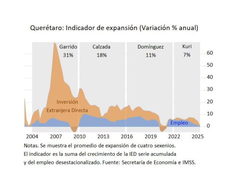 Mi planteamiento es reusar en positivo el índice de Arthur Okun utilizando variables que importan a los gobiernos locales. A este indicador lo llamé índice de expansión y consiste en sumar el crecimiento de la Inversión Extranjera Directa y la tasa de creación de empleos. Para que haya alta expansión se requiere de un aumento simultáneo de la IED ydel empleo. En la figura se muestra el caso de Querétaro durante cuatro sexenios, se observa que hay dos épocas doradas de la inversión extranjera, la primera cerca de 2006 con la instalación de la empresa aeronáutica Bombardier, y la segunda oleada de IED tuvo lugar cerca de 2016 con la ampliación de plantas de producción de Safran la empresa francesa de aeronaves.