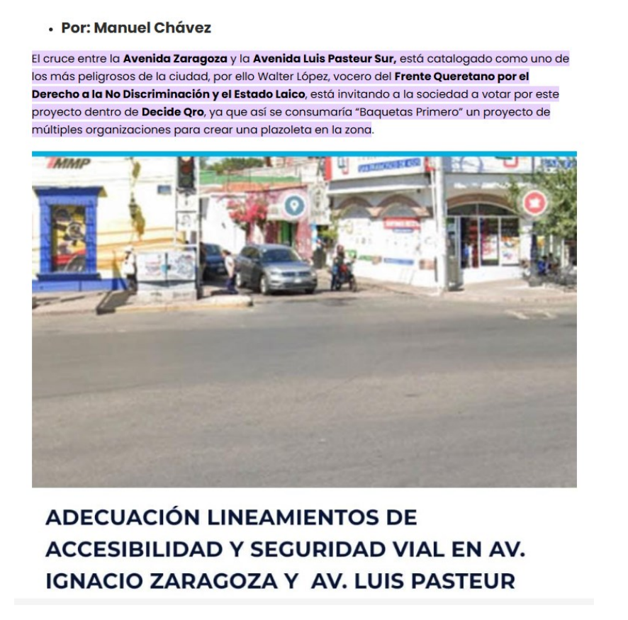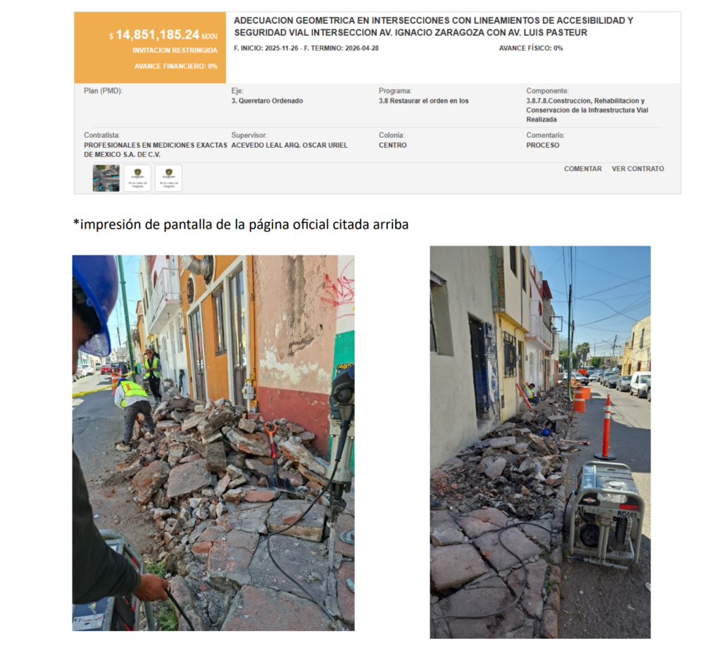 PRIMERO: Se puso a votación en enero de 2025 en la “app Decide Qro.” (acción ya violatoria al derecho de los pueblos indígenas a decidir sobre su territorio) Una obra que busca cerrar la salida vial hacia Av. Zaragoza al poniente de la comunidad para la construcción de una plaza de acceso peatonal y con nombre oficial: (Adecuación Geométrica En Intersecciones Con Lineamientos De Accesibilidad Y Seguridad Vial Intersección Av. Ignacio Zaragoza Con Av. Luis Pasteur); Obra que tuvo una mínima votación y aun asi fue incluida en el (POA)2025. Esto deja ver las intenciones turistificadoras de dicha obra, e intentaron iniciar su ejecución el lunes pasado. (Anexo 1)